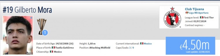 吉尔伯托-莫拉司职中场,目前效力墨西哥联赛的蒂华纳,本赛季出战8场比赛贡献3球1助的数据,身价450万欧。